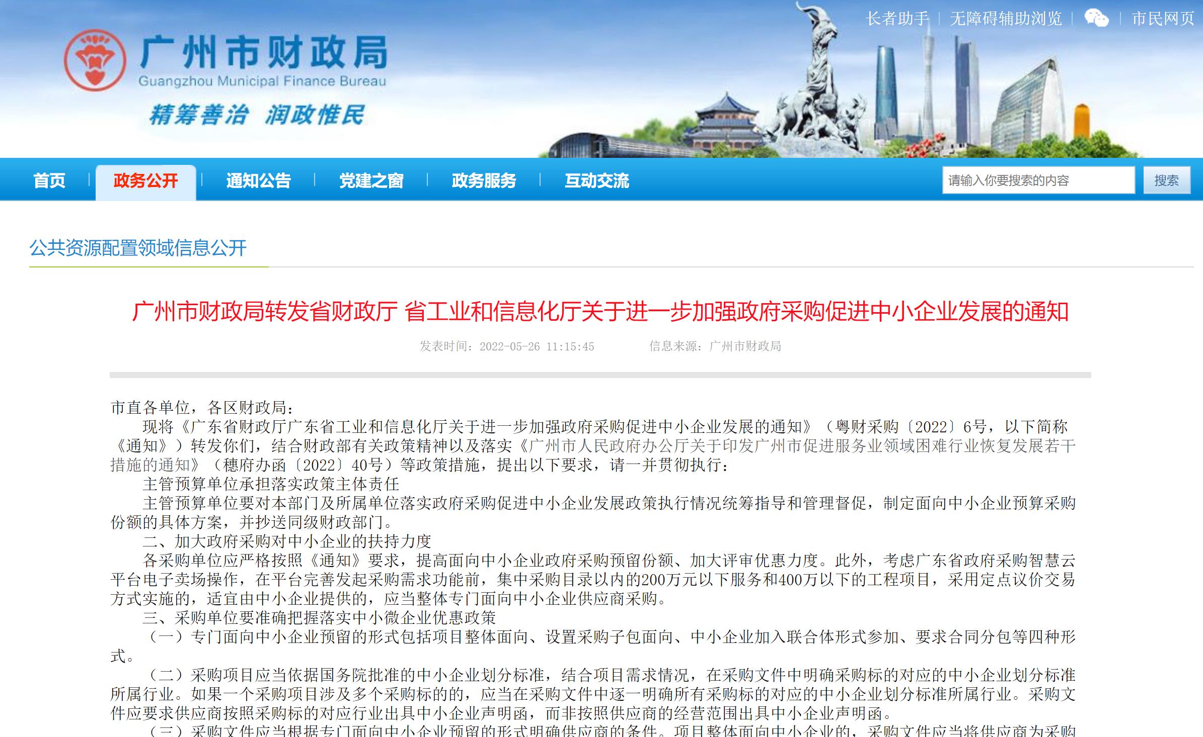 日(rì)前,廣東(dōng)省廣州市(sh↔₩ì)财政局印發《關于進一(yī)步加強政府采購(gòu)促進中小(xi€ǎo)企業(yè)發展的(de)通(tōng)知(z✘¶™hī)》明(míng)确,充分(fēn)發揮政府采購(gòu) ✔♠政策功能(néng),全方位細化(huà)政策規定,深入落實《政府采購( λ↔€gòu)促進中小(xiǎo)企業(yè)發展管理(lǐ)辦法》(以下(>φε>xià)簡稱《辦法》)的(de)相(xiàng)關規定,加大(dà)政府.™₹₩..