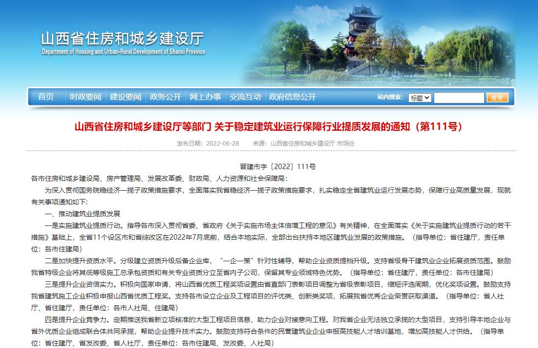 近(jìn)日(rì),山(shān)西(xī)省住建廳等4部門(mén)聯←₩合發布《關于穩定建築業(yè)運行(xíng)保障ε₽≥♥行(xíng)業(yè)提質發展的(deσ→¥)通(tōng)知(zhī)》。