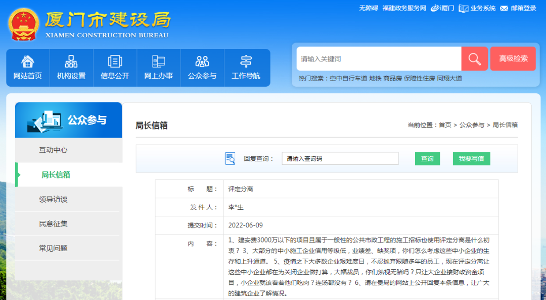 2022年(nián)6月(yuè)9日(rì),李先生(shēng)通(δπtōng)過廈門(mén)市(shì)建設局官網的(de)“局長(cháng ∏)信箱”欄目表達訴求,對(duì)目前廈門(mén)建設工(g≤ ōng)程招投标實行(xíng)的(de)“評定分(fēn)★γ÷離(lí)”辦法提出質疑,認為(wèi)“評定分(fēn)離(lí)”辦法£•∞σ可(kě)能(néng)會(huì)導緻“排斥中小(£≥×xiǎo)企業(yè)參與”的(de)現(xiàn)象發生(sh祩↔¥ng),會(huì)讓中小(xiǎo)企業(yè)的(de)β♦♣生(shēng)存更加...