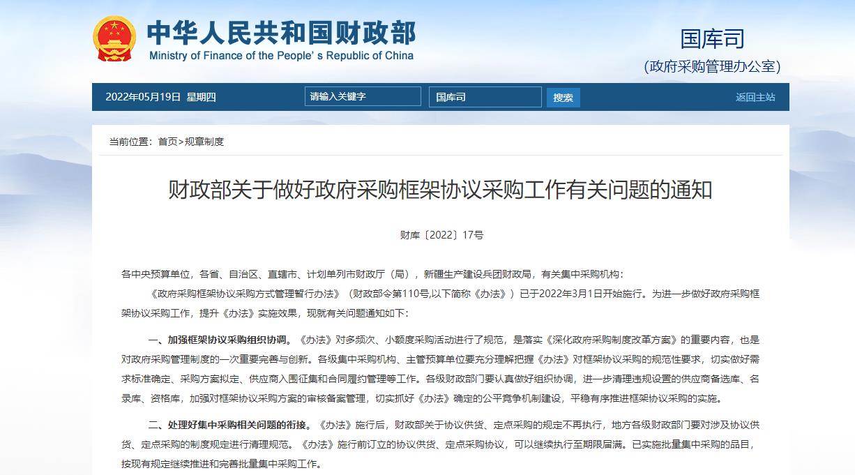 财政部關于做(zuò)好(hǎo)政府采購(gòuδ∑)框架協議(yì)采購(gòu)工(gōn≥<g)作(zuò)有(yǒu)關問(wèn)題的(de)通(¶$♣tōng)知(zhī)财庫〔2022〕17号各中央預≠φ♠£算(suàn)單位,各省、自(zì)治區(q£φ"ū)、直轄市(shì)、計(jì)劃單列市(shì)财政廳(局),新疆生(sh∑ ēng)産建設兵(bīng)團财政局,有(yǒu)關集中采購(gòu)機(jī∞ )...