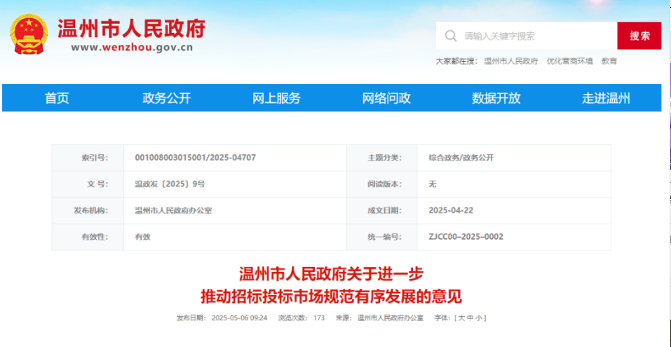 日(rì)前,溫州市(shì)人(rén)民(> '↑mín)政府發布《關于進一(yī)步推動招标投标市(shì)場(chǎng)規 "♣範有(yǒu)序發展的(de)意見(jiàn)》。本意見(ji← àn)自(zì)2025年(nián)6β>$✔月(yuè)1日(rì)起實施。 依法保障評标專家(jiā)獨立開(kāi♦ ≤$)展評标,做(zuò)到(dào)全程留痕、可(kě)追溯,評标專家(jiāα±φ)...