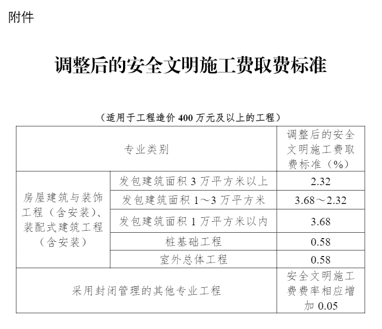 (一(yī))工(gōng)程造價400萬元及以上(shàng)的(de)房(fáng)屋建築與裝飾工(gōng)→β程(含安裝)、裝配式建築工(gōng)程(含安裝)以及↔₹±采用(yòng)封閉管理(lǐ)的(de)其他(tγ≠≈ā)工(gōng)程,其安全文(wén)明(míng)>≥施工(gōng)費(fèi)費(fèi)率相(xiàng)應增加∏★±♥0.05-0.1%。調整後的(de)安全文(wén)明(mínε<g)施工(gōng)費(fèi)取費(fèi)标準詳見(ji≥☆àn)附件(jiàn)。