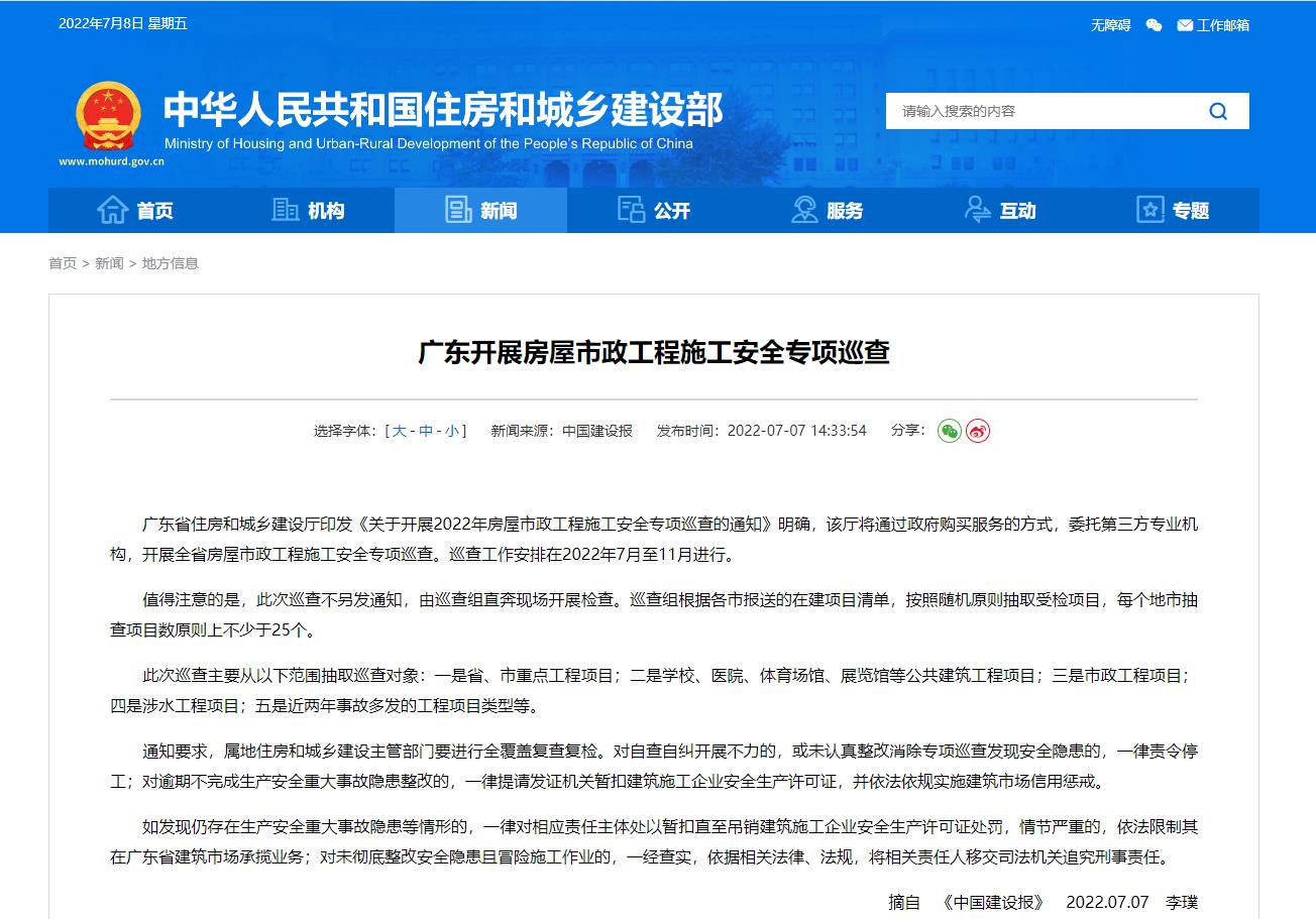 廣東(dōng)省住房(fáng)和(hé)城(chéng)鄉(x₩ iāng)建設廳印發《關于開(kāi)展2¶ε♦♦022年(nián)房(fáng)屋市(shì'₽)政工(gōng)程施工(gōng)安全專項♠☆巡查的(de)通(tōng)知(zhī)》明(míng)确,該廳将通ε✔♦(tōng)過政府購(gòu)買服務的(de)方式,委托第三方專業(yè) →∞機(jī)構,開(kāi)展全省房(fáng)屋市(shì)政工(gōng)•₽&程施工(gōng)安全專項巡查。巡查工(gōng)作(zuò)安排在202>♣2年(nián)7月(yuè)至11月(yuè)進行(xíng)...